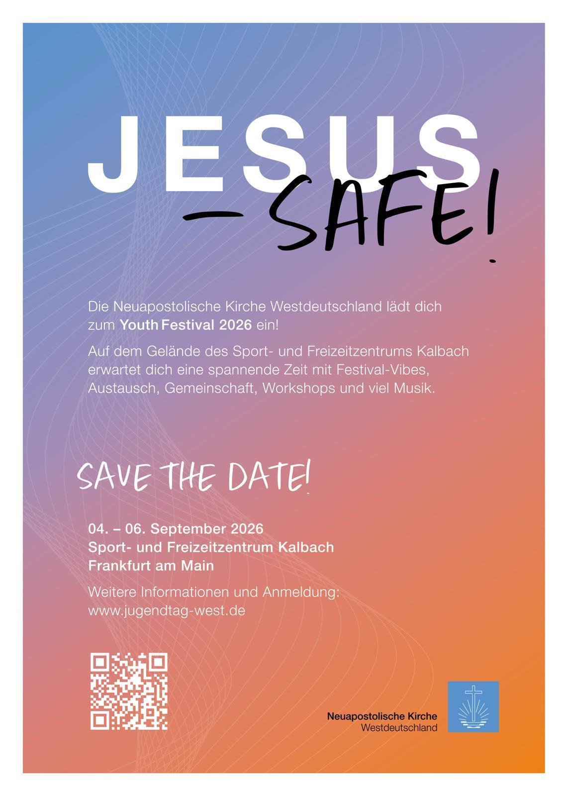 Dieses Jahr wird der Jugendtag zu einem Youth-Festival! Erlebt unter dem Motto „Jesus – Safe“ vom 4. bis 6. September 2026 in Frankfurt auf dem Event-Gelände Sportzentrum Kalbach eine außergewöhnliche Zeit mit Festival-Vibes, Workshops und viel Musik. Vertiefe deinen Glauben, feiere mit Jugendlichen aus ganz Europa und genieße die unvergessliche Gemeinschaft!